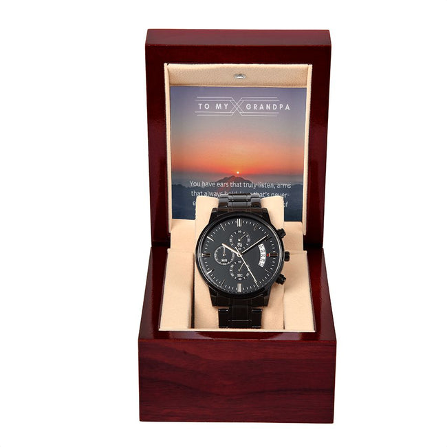 A handsome gift that can withstand constant use, this Black Chronograph Watch is perfect for all the special men in your life. A thoughtful present to your groomsmen, an anniversary memento, or a long-lasting keepsake for Father’s Day - it's a versatile piece sure to warm hearts and create smiles. Featuring a three-dial face, calendar function, and luxury pointer in a water-resistant and scratch-proof vessel.